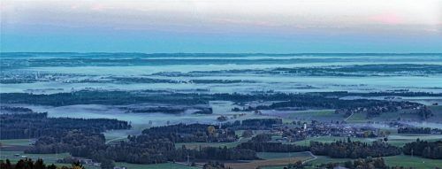 Leichte Nebelschwaden ziehen über die Landschaft, bevor sie von der Sonne aufgelöst werden, die sich bereits mit einem leichten Morgenrot ankündigt. Zu sehen ist die Ortschaft Lauterbach. Der Aufnahmestandort von Leser Ludwig Lernbecher aus Rohrdorf war die Aussichtskapelle vom Samerberg. Foto Lernb