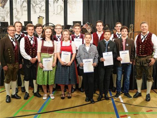 Im Rahmen des Herbstkonzerts der Musikkapelle Neubeuern ehrte Bezirksdirigent Christoph Danner Simone Datzmann auf der Flöte, Johannes Antretter auf der Posaune, Vinzenz Stadler am Flügelhorn, Moritz Eutermoser und Valentin Böhm auf der Trompete (alle Abzeichen in Bronze). Mit Silber ausgezeichnet w