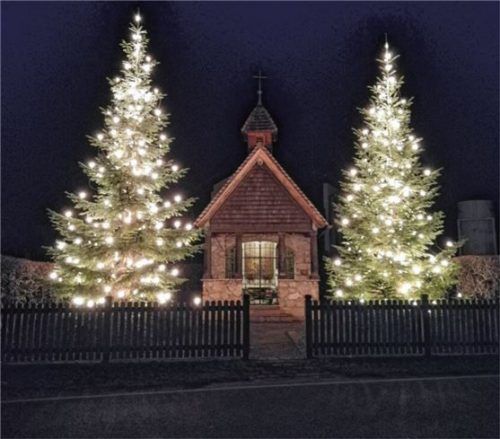 „Und Friede den Menschen, die guten Willens sind“. Hell leuchten die Christbäume am Wildenwarter Kriegerdenkmal in die Nacht – sie erinnern daran, dass die Welt nicht immer so friedlich war und nicht überall so friedlich ist, wie in dieser klaren Nacht im Chiemgau.Foto Rehberg