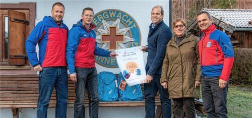 Die Bergwacht Brannenburg sieht sich gut für Lawinenunfälle gerüstet. Zur Anschaffung von dringend benötigten Lawinenrucksäcken erhielt die Bergwacht von der Firma oelcheck GmbH einen Scheck in Höhe von 4500 Euro. Unser Bild zeigt (von links) den stellvertretenden Bereitschaftsleiter Leonhard Pichle