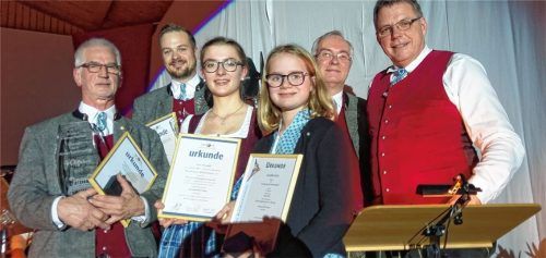 Im Rahmen des Cäcilienkonzerts ehrte der Vorsitzende der Musikkapelle Kiefersfelden, Werner Schroller (rechts), und der Vorsitzende des Bezirks Inn-Chiemgau im Musikbund Ober- und Niederbayern, Leonhard Eisner (Zweiter von rechts), sowohl langjährige Mitglieder als auch junge Musikerinnen, die im Ra