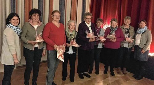 Die Katholische Frauengemeinschaft Halfing hatte zum Jahresabschluss zu einer Feier eingeladen. Dabei bedankte sich Regina Anzinger bei den Fahnenträgern, den vielen Helfern und bei den langjährigen Mitgliedern, die mit einer Urkunde und einem Geschenk für ihre Treue geehrt wurden. Für 40 Jahre Mitg