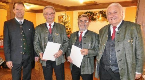 In einer kleinen Feierstunde ehrte der Männergesangverein Großkarolinenfeld langjährige treue Mitglieder. Für 65 Jahre aktive Mitgliedschaft erhielt Werner Härter, der wegen Krankheit an der Ehrung nicht teilnehmen konnte, eine Urkunde. Ebenso erhielt Adolf Wimmer (Zweiter von links), der seit 60 Ja