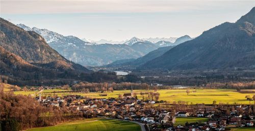 Vom Samerberg aus gelang unserem Fotografen dieses imposante Bild vom Inntal.Vor dem Betrachter liegt Nußdorf. Zwischen Kranzhorn (links) und Wildbarren (rechts) teilt der Inn das Tal. Im Bildhintergrund grüßen die Tiroler Schneeberge.