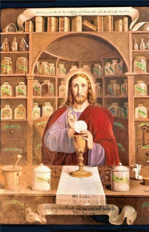 Das Gemälde „Christus Medicus – Jesus der himmlische Arzt“ hing früher in der Klosterapotheke auf der Fraueninsel und zeigt Jesus in der räumlichen Umgebung einer Apotheke. Für den glaubenden Menschen ist das die Himmelsapotheke, die alles bereithält, was zur Heilung an Seele, Geist und Leib erforde