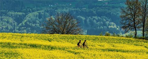 Sonnengelbe Rapsfelder versprühen auf den Feldern derzeit förmlich gute Laune – und sind aufbauende Hoffnungszeichen in Zeiten von Corona. Auch wenn die Ausgangsbeschränkungen noch andauern, kann man sich an der Schönheit der Natur erfreuen. Unser Bild zeigt Rapsfelder im Inntal. Im Hintergrund erhe
