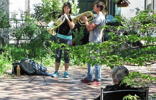 Zwei junge Musiker haben überraschend ein kleines Konzert im Innenhof des Seniorenwohnheims Katharina in Bad Endorf gegeben. Bei Sonnenschein sind Veronika Grießer und Tobias Opperer zur frühen Nachmittagsstunde im Innenhof des Katharinenheims eingetroffen. Mit dabei hatten sie zwei Blechblasinstrum