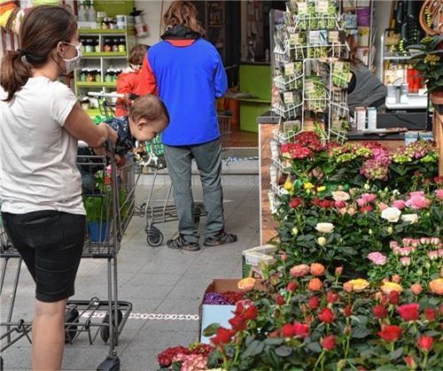 Mit Maske und gehörigem Abstand zum Einkaufen