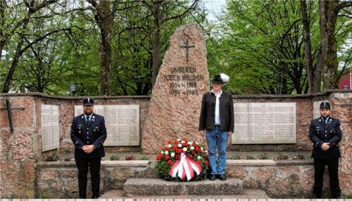 Im Namen der Vereine legten beim gemeinsamen Jahrtag der Stephanskirchner Ortsvereine (von links) Christian Holewa, Kommandant der Feuerwehr Schloßberg, Michael Weber, Erster Vorsitzender des Krankenunterstützungsvereins Ziegelberg und Florian Weinhammer, Erster Vorsitzender der Feuerwehr Schloßberg