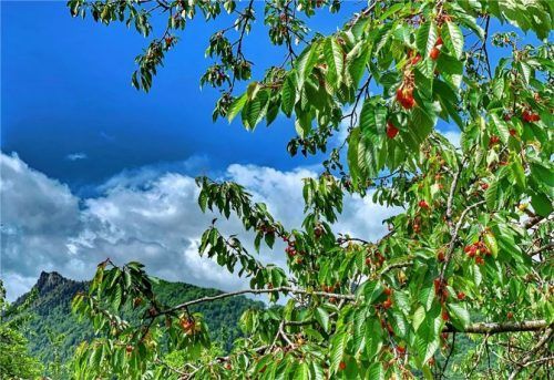 Die Kirschenzeit hält Einzug im Priental. Sattrot und kugelrund hängen inzwischen schon die ersten Kirschen in diesem Jahr am Baum und im Hintergrund das markante Felsmassiv vom Zellerhorn. Was kann es Schöneres geben, als sich bei voller Reife die aromatischen Früchte schmecken zu lassen und sich d
