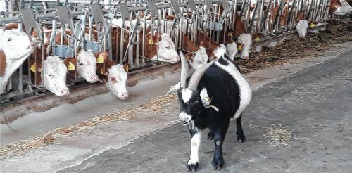 Ziegenbock „Fredi“ gefällt es in Josef Summerers Stall in Stephanskirchen. Ganz besonders, wenn die Bewohnerinnen anwesend sind und er die Parade abnehmen kann. Was nicht immer der Fall ist, denn die Kühe wohnen in einem Laufstall und können kommen und gehen, wann sie wollen. Fredi ist pfiffig, weiß
