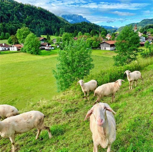 Der Regen ist am Fronleichnamstag abgezogen und genüsslich grasen diese Schafe auf der satten grünen Wiese im Bergsteigerdorf Sachrang. Noch bis zum 25. Juni dauert die meteorologische Singularität, die legendäre „Schafskälte“ an. Den Namen trägt diese Wetterlage nach den Schafen, die traditionell b