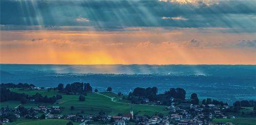 Nach einem schwülen Sommertag, den abwechslungsreiches Wetter geprägt hat, braute sich auf dem Samerberg abends am Himmel wieder etwas zusammen. Ehe es zum Gewitterregen kam, vermischten sich die Strahlen der untergehenden Sonne mit den immer stärker werdenden Wolken sowie mit der Samerberger Landsc
