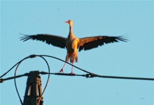 „Zufällig schweift der Blick von der Terrasse hinüber zum etwa 300 Meter entfernten Strommast. Man hat schon so einiges gesehen, was sich darauf versammelt oder getroffen hat: Stare auf dem Weg in den Süden oder schwindelfreie Techniker bei der Reparatur des stählernen Riesen. Aber noch nie einen ta
