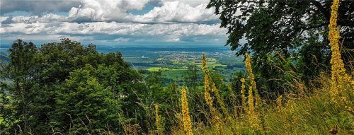 Von einem versteckten Platz hinterm Wirtshaus auf dem Petersberg bietet sich dieser königliche Ausblick auf das Inntal und die Gemeinde Raubling mit dem Ortsteil Reischenhart im Vordergrund, unter weißblauem Himmel und über herrlich blühende Königskerzen hinweg. Besteigt man den Petersberg von Süden