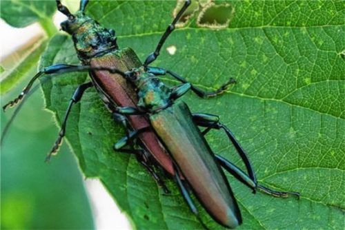 In seinem Garten in Raubling fotografierte Ludwig Roth bei der Brombeer-Ernte einen Moschusbock bei der Paarung. Bei den männlichen Tieren sind die Fühler länger, bei den weiblichen Tieren etwas kürzer als der Körper. Die asiatische Variante (Aromia bungii) ist glänzend schwarz und hat ein rotes Hal