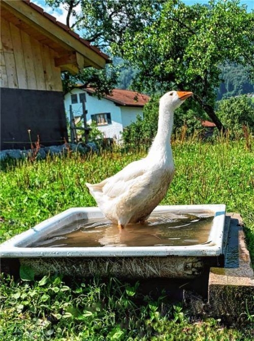 Die warmen Temperaturen der letzten Tage lassen einen schon mal zum Schwitzen bringen. Eine Möglichkeit wäre es, sich in den Schatten zu verziehen und alle Viere von sich zu strecken. Oder man macht es wie diese gefiederte Hausgans aus Aschau im Chiemgau: Ins kühle Nass steigen und sich erfrischen.