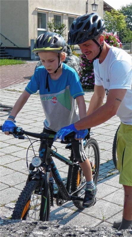 Eine große Schar Ferienkinder kam zum Fahrtechniktraining auf dem Mountainbike zum Volksfestplatz und Kolbererplatz in Großkarolinenfeld. Lukas Niedermeier von Top on Mountain Brannenburg zeigt gerade einem Schüler die Technik, ohne Probleme mit dem Mountainbike zu wenden. Foto Greiner