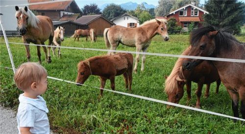 Immer wieder gerne beobachtet, wie hier vom 20 Monate alten Maxi, werden die Pferde auf der Weide an der Aschaffenburger Straße in Raubling. Der „Star“ in der Pferdekoppel ist derzeit ein Mini-Pony-Fohlen namens Luigi. Pferde- und Ponyhalter Toni Schwaiger junior aus Pfraundorf freut sich sehr über