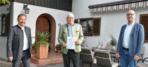 Der Vorsitzende des CSU-Ortsverbandes Stephanskirchen, Stephan Jonke (links), und sein Stellvertreter Rainer Kemnitzer (rechts) gratulierten Altbürgermeister Rudolf Zehentner zu 50 Jahren CSU-Mitgliedschaft und überreichten die Dankurkunde des Bezirksverbands mit goldener Anstecknadel. Zehentner tra