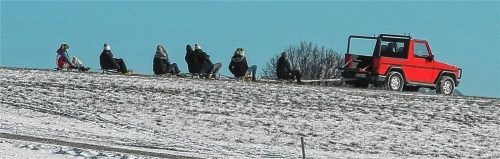 Wenn der Schlittenberg nicht mehr lang oder steil genug ist, die Lifte nicht in Betrieb sind und ein Husky-Rudel ebenfalls nicht zur Verfügung steht, behelfen sich manche größere Schlittenfans auch gern mal anders. So wie diese Schlittenfahrer, die sich mit Motorkraft über die verschneiten Felder am