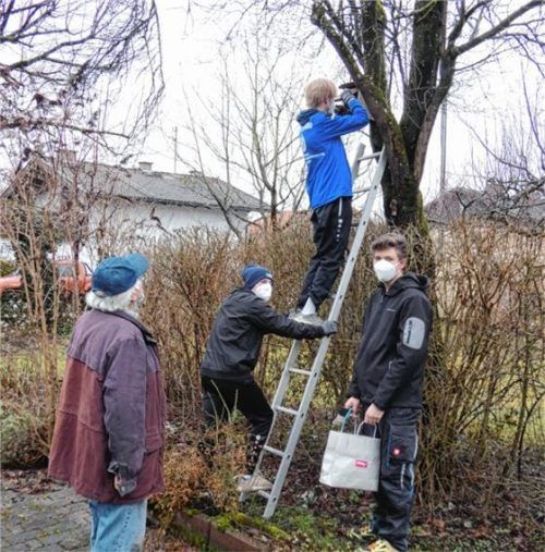 Sepp Stadter (links) zog mit einigen Helfern durch Großkarolinenfeld, um Vogelhäuschen zu reinigen. Aus 30 Häuschen wurden die alten Nester entfernt. Damit keine Krankheiten übertragen werden, wurden sie auch von Ungeziefer gereinigt. Foto Greiner