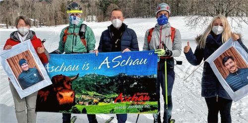 Das Empfangskomitee: Aschaus Tourismuschef Herbert Reiter (Mitte) gratuliert zusammen mit Tourist-Info-Mitarbeiterin Andrea Volkelt (links) und Auszubildender Stefanie Sattlberger (rechts) den Skibergsteigern Alex (Zweiter von links) und Alois Kunz.