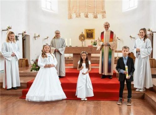 Coronabedingt aufgeteilt in drei Kleingruppen haben zwölf Kinder des Pfarrverbands Bad Endorf in der Pfarrkirche St. Jakobus im Beisein ihrer Familien ihre Erstkommunion gefeiert. Pfarrer Klaus Hofstetter (Bild rechts, rechts), Pater Joshy (Bild Mitte, links) und Gemeindereferentin Ursula Stacheder