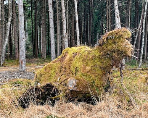 Bricht hier ein moosbewachsenes Urzeit-Tier aus einem Wald in Raubling? Auf den ersten Blick scheint es so, doch schnell entpuppt sich das „Tier“ als Stumpf eines wohl schon länger entwurzelten Baumes, der bereits abgesägt wurde. Auf dem darauf verbliebenen Waldboden ist Moos gewachsen. Manchmal kom