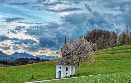 Noch mit einem lauten Donnern und einem Graupelschauer sagte der April ade. Dieses Bild zeigte sich dabei an der Brunnenkapelle neben der Wallfahrtskirche St. Florian bei Frasdorf. Doch es kann wettern, wie es will, der achteckige Bau von 1659 ist standhaft geblieben. Das Innere des Gebäudes zieren
