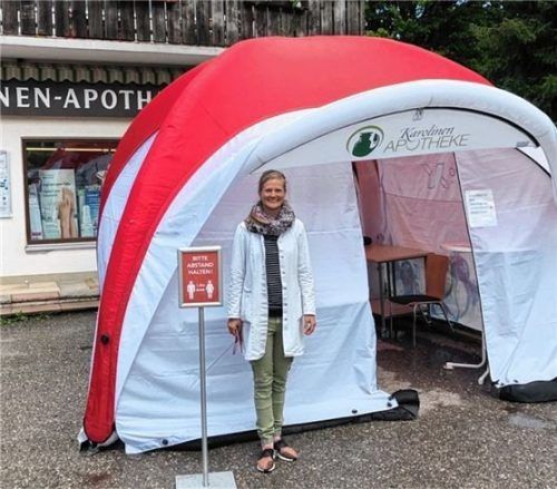 Auch in Großkarolinenfeld besteht nun die Möglichkeit, sich ohne Kosten und Anmeldung in Zusammenhang mit dem Coronavirus testen zu lassen. Zu diesem Zweck wurde kurzerhand vor der Karolinenapotheke ein Zelt aufgebaut. Für Kinder bietet Apothekerin Katharina Greiner (Bild) auch Spucktests an. Mit de