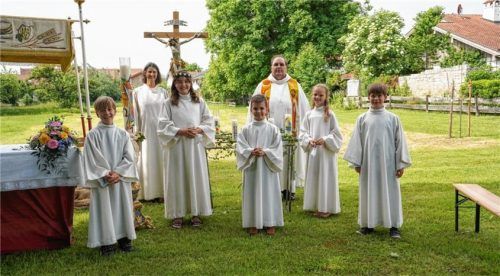 Im Pfarrgarten, unter einem großen Ahornbaum, feierte die Pfarrei St. Vitus am 19. Juni Erstkommunion. In zwei getrennten Gottesdiensten empfingen zum ersten Mal 14 junge Christen die heilige Kommunion. Die Vorbereitung gestaltete sich schwierig. Unter Leitung von Pfarrer Herbert Aneder und Gemeinde