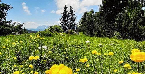 Bei einem Ausflug mit der Hochriesbahn auf den Gipfel gelang Leser-Reporter Rudolf Oberfuchshuber aus Söchtenau ein malerisches Foto von der satten Bergblumenwiese. Der strahlende Himmel steht im Kontrast zu den farbenfrohen gelben Blüten und dem umsäumenden Grün der Wiese umrahmt von Bäumen.