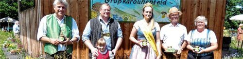 Der Bienenzuchtverein Großkarolinenfeld feierte einen Tag der offenen Bienentür. Die bayerische Honigbienenprinzessin Alexandra Krumbachner gab Auskunft über die Bienen. Über den regen Besuch freuten sich: (von links) Bürgermeister Bernd Fessler, der Schechner Bürgermeister Stefan Adam mit seiner kl