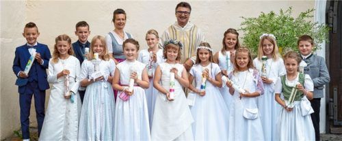 Zehn Mädchen und drei Buben empfingen im Kreise ihrer Familien in der Pfarrkirche St. Vitus in Nußdorf ihre heilige Erstkommunion. „Vertrau mir, ich bin da“ war das Thema der Feier. In der Kirche bekamen die Kinder durch Pfarrer Christoph Rudolph den Leib Christi. „Du musst Jesus zu dir lassen, er w
