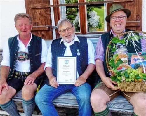 Die Gebirgsschützenkompanie Samerberg hat ihrem Mitglied Wolfgang Maurer (Mitte) zu dessen 70. Geburtstag die Ehrenmedaille der Samerberger Schützen verliehen. Hauptmann Fritz Dräxl (links) und Leutnant Peter Schrödl (rechts) überbrachten auf seinem Hof in Laberg einen Geschenkkorb und die Ehrenurku