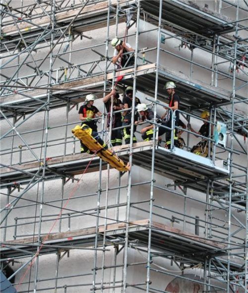 Den in ein Baugerüst gehüllten Frasdorfer Kirchturm haben die Feuerwehren Frasdorf und Umrathshausen für eine groß angelegte Übung genutzt. Dabei wurde die Rettung zweier Personen simuliert, die in 60 Metern Höhe auf dem Gerüst gezündelt hatten und sich nicht trauten, wieder abzusteigen. So war das