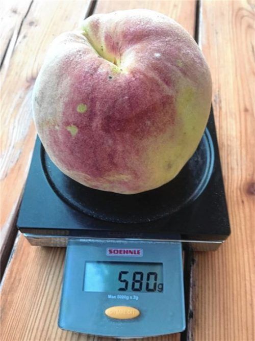 Einen schwergewichtigen Pfirsich hat Leser-Reporter Hans Schartner aus Miesham aus dem Gemeindegebiet Eggstätt geerntet. Die Frucht bringt insgesamt 580 Gramm auf die Waage.Foto Schartner