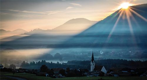 Früh am Morgen geht die Sonne über dem Riesenberg auf. Die Strahlen schauen bereits über die Bergkante. Im Tal verzieht sich allmählich der Nebel. Im Vordergrund liegt Törwang. Die Kirchturmspitze von Mariä Himmelfahrt streckt sich in die Höhe. Im Hintergrund ist die Kirche von Sankt Ägidius und Nik