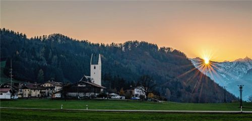Die Sonne schaut über die Kante der schneebestäubten Berge. Ihre Strahlen bilden einen golden funkelnden Kranz. Über dem Samerberger Ortsteil Roßholzen breitet sich ein romantischer Abendhimmel aus.Foto Nitzsche