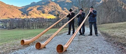 wurde das Geläut von den drei Alphornbläsern Hans Bauer, Erich Gawlik und Anderl Pertl (von links) vor dem Stadel vom Oberweidachjörg am Bankerlweg
