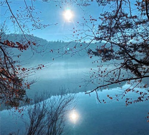 Ein idyllisches Farbspiel bot der Hechtsee den zahlreichen Wanderern, die das zwischen Kiefersfelden und Kufstein gelegene Gewässer zum Beginn des neuen Jahres umrundeten. Während er einerseits als Spiegel für die Mittagssone diente, machte ein Blick durch das Geäst an der Uferböschung auch eine lei