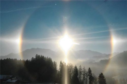 Das Foto eines „Halos“ sandte uns Leser-Reporter Sepp Resch aus Oberaudorf. Die Lichteffekte entstehen durch Reflexion und Brechung von Licht an Eiskristallen. Ursache könnte in diesem Fall die Beschneiungsanlage am Hocheck in Oberaudorf sein, vermutet Leser-Reporter Sepp Resch. Foto Resch