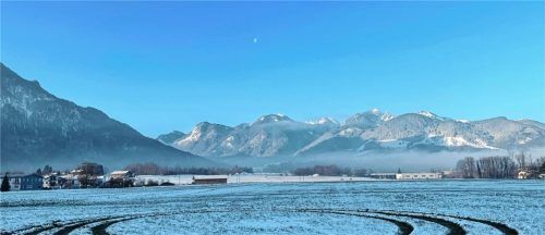 Flintsbach wartet auf die wärmende Sonne, welche die von Frost überzogenen Berge und Täler enteist. Das Inntal zeigt sich in einem morgendlichen Nebelschleier. Die Sonne scheint auf die Berge. Die weißen Gipfel scheinen zu leuchten. Die Leser-Reporterin Claudia Pfurtscheller aus Litzldorf hielt dies