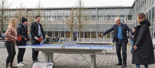 Schuldirektor Dr. Armin Stadler nahm den Scheck der Volksbank Raiffeisenbank über 2000 Euro für eine Tischtennisplatte im Pausenhof des Gymnasiums Raubling entgegen. „Die Platten sind in der Pause sofort belegt. Da wird mit den unterschiedlichsten Bällen, vom Tischtennis- bis zum Fußball, von vielen