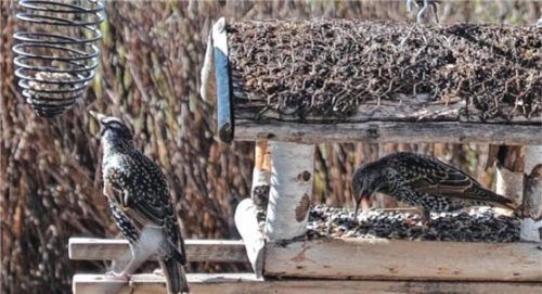 Die ersten Stare untersuchten das frisch gefüllte Futterhäuschen in einem Stephanskirchener Garten. Sie hatten offensichtlich Hunger und bedienten sich sowohl am Futter im Häuschen, wie auch am daneben hängenden Meisenknödel. Wahrscheinlich kehren die Zugvögel durch die Klimaerwärmung immer früher z
