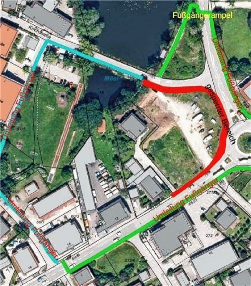 Voraussichtlich ab Montag, 28.März, wird im Zuge der Bauarbeiten für das Seniorenzentrum der Gehweg rund um das Grundstück für längere Zeit gesperrt werden. Damit alle Bürger und vor allem auch die Schulkinder trotzdem sicher an ihr Ziel kommen, sind zwei alternative Wege vorhanden: Zum einen von de