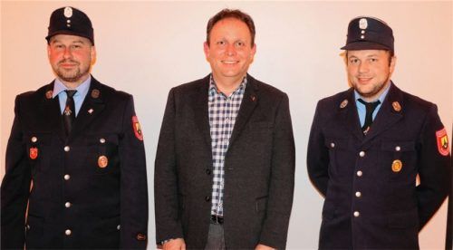 Florian Fischer (links) und Martin Zettl (rechts) bleiben auch in den kommenden sechs Jahren Kommandanten der Feuerwehr von Wildenwart. Die Wahlen wurden in der Frasdorfer Lamstoahalle unter der Leitung von Bürgermeister Daniel Mair (Mitte) durchgeführt. 32 aktive Feuerwehrleute bestätigten die bish