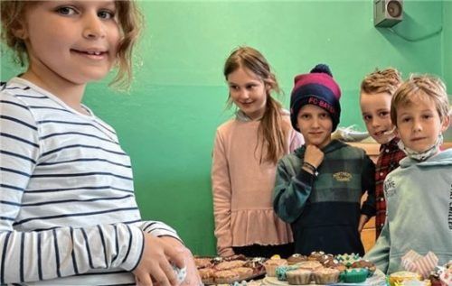 Die Not der Ukraine lindern, dazu wollten auch die Grundschüler in Söllhuben beitragen. So entstand die Idee eines Verkaufstags „Schüler an Schüler“, der stolze 900 Euro einbrachte. Die Kinder buken, bastelten und bestückten ihre Marktstände. An einem Tisch lockten Muffins, Küchlein und Cakepops (re