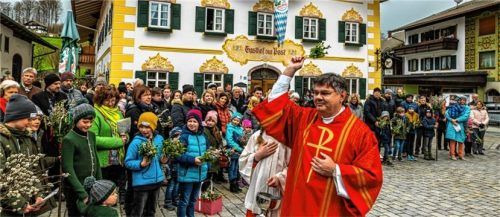 Festlich war die Palmweihe auf dem Samerberg, zu der sich Jung und Alt in großer Anzahl auf dem Dorfplatz von Törwang eingefunden hatten. Die Segnung nahm Diakon Günter Schmitzberger vor (unser Bild). Die Gestaltung übernahmen Bläser aus den Reihen der Musikkapelle Samerberg.Foto Nitzsche